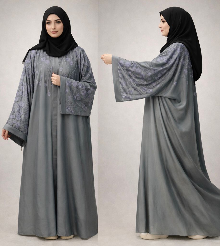 A timeless steel grey abaya designed to flow with elegance and authority. The premium nida fabric creates a smooth, structured fall, while the embroidered sleeves introduce a refined artistic touch. This piece balances modern minimalism with traditional modesty, making it suitable for formal gatherings, workwear, or evening wear. The muted embroidery adds sophistication without distracting from the overall silhouette.